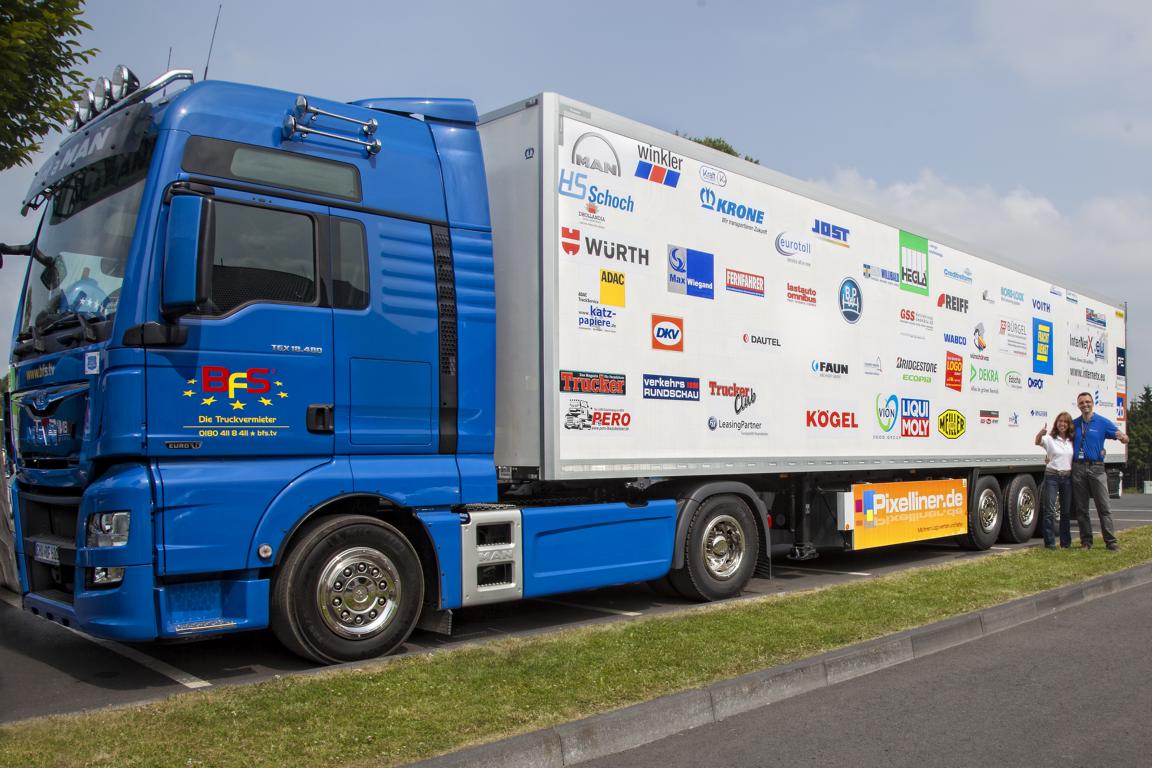 Es ist geschafft - der Pixelliner, der Lkw mit derzeit 111 Logos, ist offiziell an den Start gegangen. Aus diesem Anlass hat Frank Neumann, Initiator des Pixelliners, beim Truck-Grand-Prix auf dem Nürburgring eine Spende von etwas mehr als 5000 Euro an den Verein wünschdirwas e.V. übergeben. Der Verein aus Köln erfüllt kranken Kindern Herzenswünsche. Begleitet wurde die Spendenübergabe durch Schirmherr Jumbo Schreiner. Übrigens, das Logo von Lange Kommunikation befindet sich auch auf dem Pixelliner. Fotos: Christine Trewer